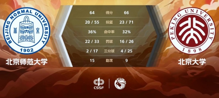 加时赛前北京大学教练被夺权送罚球,李青阳两罚一中为北京师大率先拿分,北大则以伍湘琳的抛投做出回应。拉锯战北京师大连续出现失误,北京大学则几次出手都没能命中且几次可以拉开比分的罚球不中导致悬念留到最后,北京师大最后有机会反超但两次机会都没能转化成进球。最终,北京大学66-64加时力克北京师范大学杀入总决赛。
