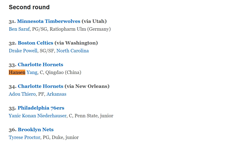 链接>>>首次进入ESPN榜单!ESPN选秀模拟排名更新:杨瀚森59位被火箭选中