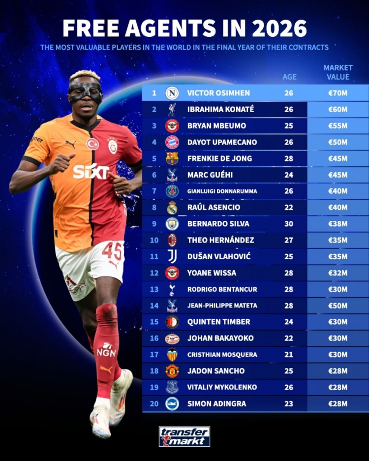 合同年球员身价:奥斯梅恩居首,于帕、德容、多纳鲁马、特奥在列